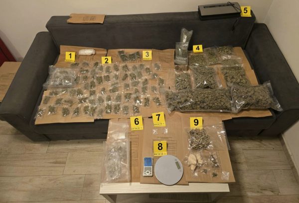 Policija je najpre pretresom kod osumnjičenog pronašla oko 500 grama praškaste materije nalik na kokain, a potom i pretresom stana koje on koristi, pronašla i pet kilograma biljne materije za koju se sumnja da je marihuana, kao i pola kilograma psihoaktivnih pečurki i oko 200 grama praškaste materije za koju se sumnja da je sintetička droga „kristal met“, saopštio je MUP.