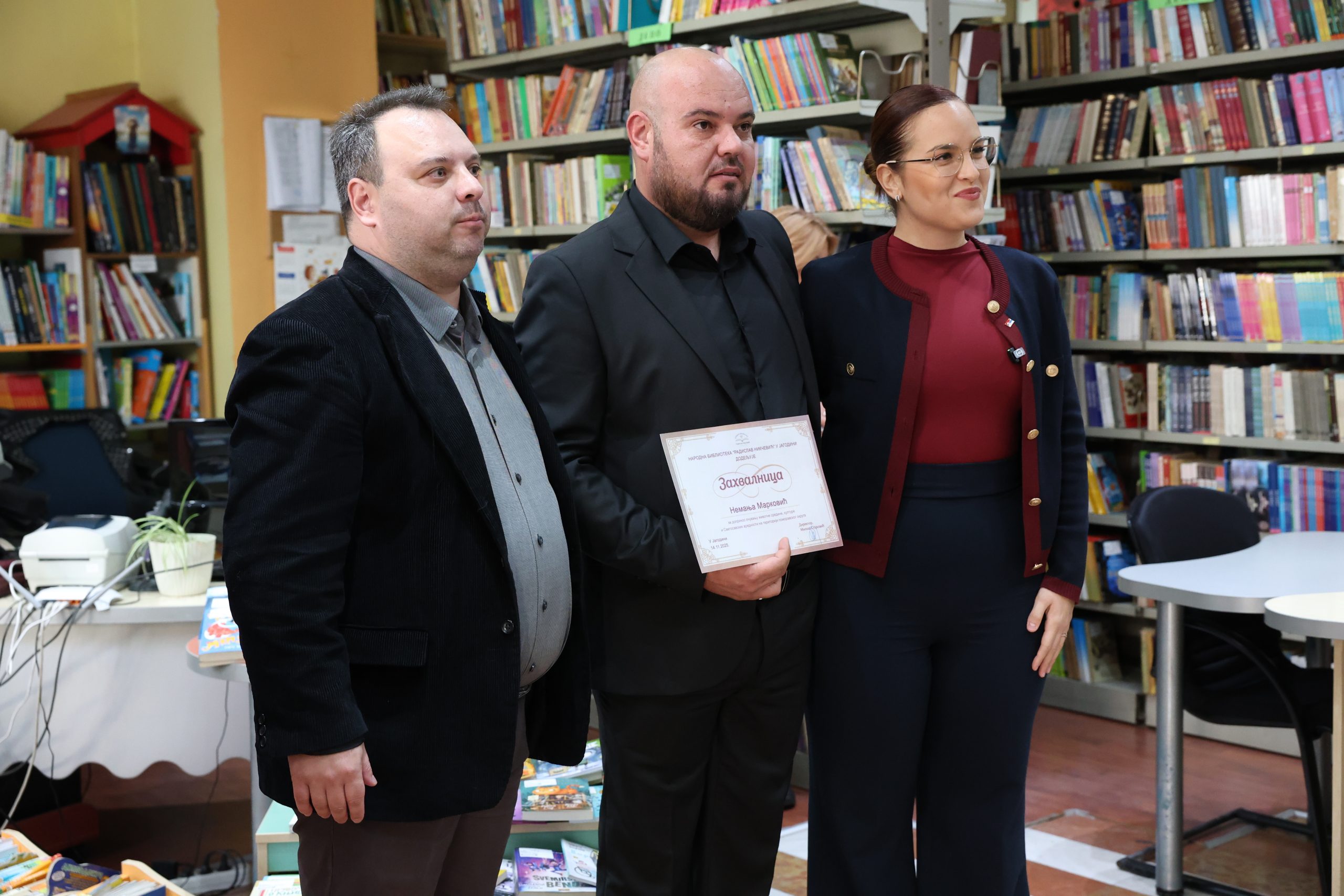 Direktor Narodne biblioteke „Radislav Nikčević“ u Jagodini Miloš Stojković uručio je ministarki Sari Pavkov posebnu Povelju i člansku kartu ove ustanove. „Možda se pitate odkud ministarka za zaštitu životne sredine u biblioteci. Postoje ljudi u timu Aleksandra Vučića, u timu Miloša Vučevića i u timu Dalibora Markovića koji vodi grad Jagodinu, koji se brinu o svemu i koji su na svim frontovima. Sara Pavkov je jedna od najboljih ministara u Vladi Srbije i uvek je posvećena čoveku i svojoj otadžbini. Borba za životnu sredinu nije samo ekološka i nikako ne smemo da zaboravimo i kulturu, tradiciju i naš identitet. Energija i rad ministarke Pavkov me često podsećaju na sve ono što su zajedno 12 godina radili predsednik Srbije Aleksandar Vučić i naš brat, sada sa neba, Dragan Marković Palma“, izjavio je Stojković.