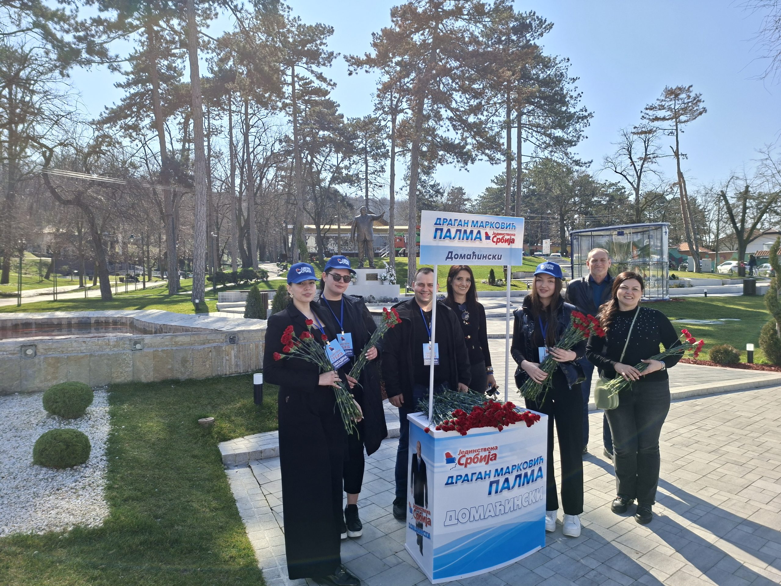Pored štandova na pijaci u Jagodini, Jedinstvena Srbija je organizvala podelu karanfila i u Turističko memorijalnom kompleksu „Dragan Marković Palma“. Jedinstvena Srbija je stranka koja je poznata po širokoj mreži Aktiva žena u Srbiji, a u lokalnoj samoupravi u Jagodini žene zauzimaju vodeća mesta počevši od gradonačelnice Jagodine. Crveni karanfil simbolizuje Dan žena, jer su učesnice na skupovima za prava žena početkom prošlog veka nosile crvene karanfile na reverima.