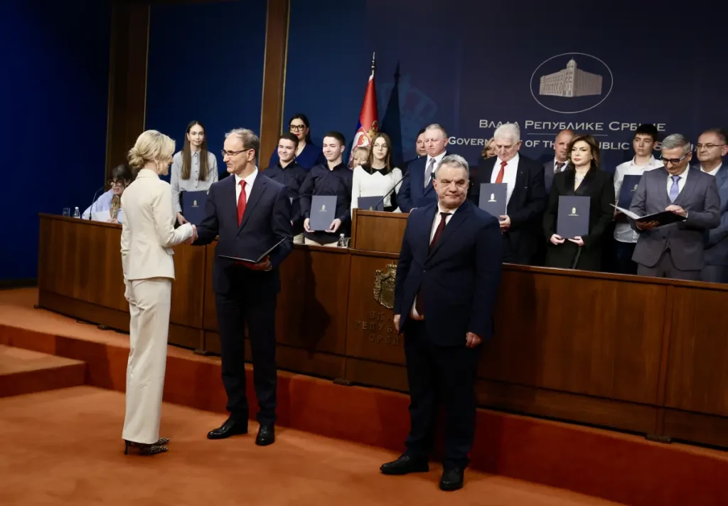 Predsednik Vlade Srbije Đuro Macut i ministar prosvete Vuk Dejan Stanković uručili su, na ceremoniji u Vladi Srbije, 31 Svetosavsku nagradu pojedincima i institucijama za postignute izuzetne rezultate u oblasti obrazovanja i vaspitanja za 2025. godinu.