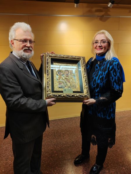 U ime Fondacije Braća Karić i Pećke Patrijaršije, Milanka Karić predala je ikonu Presvete Bogorodice predsedniku Matice Srpske Draganu Staniću.