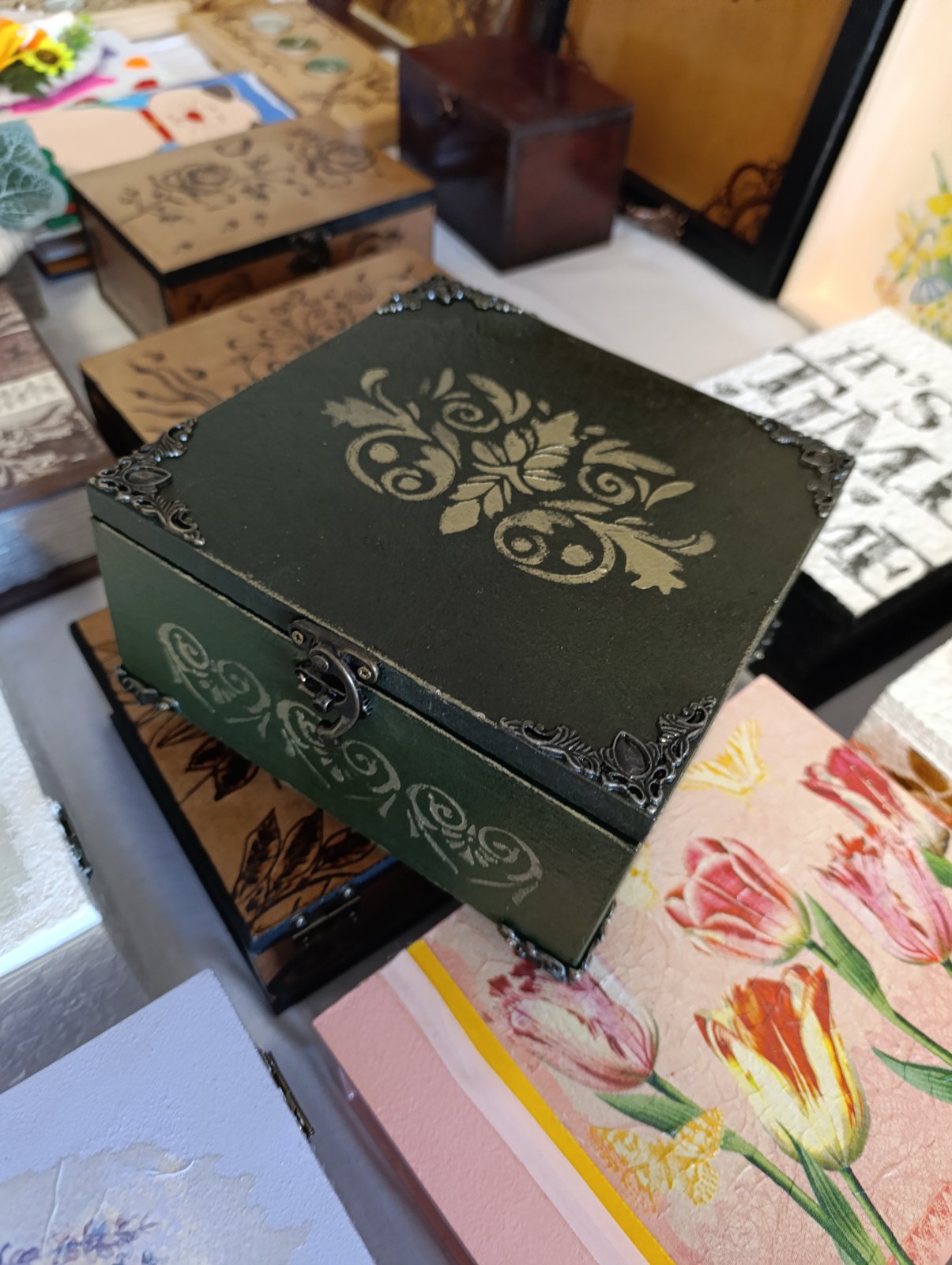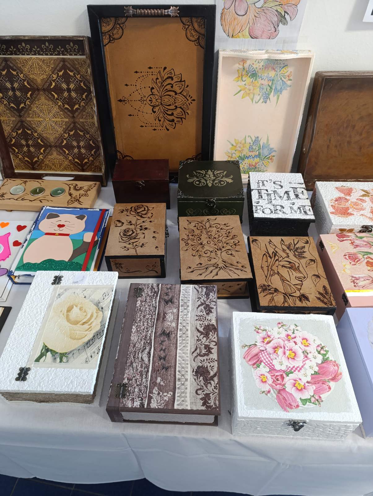 Pacijenti su i ove godine izradili najrazličitije upotrebne i dekorativne predmete – kutije za nakit, svećnjake, ogledala, poslužavnike, podmetače za čaše dekorisane kombinacijom oslikavanja i dekupaž tehnikom, rezbarenjem ili tehnikom pirografije.