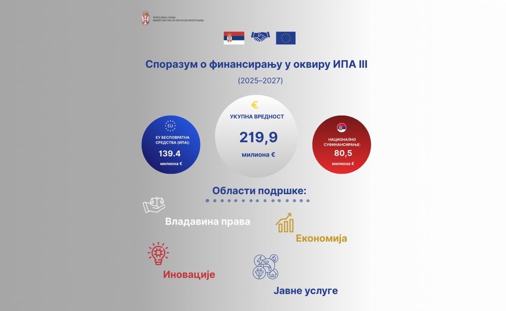 Republika Srbija i Evropska unija potpisale su Sporazum o finansiranju u okviru Instrumenta za pretpristupnu pomoć – IPA III, vredan 219,9 miliona evra za period 2025.–2027., od čega bespovratni doprinos EU iznosi 139,4 miliona evra.