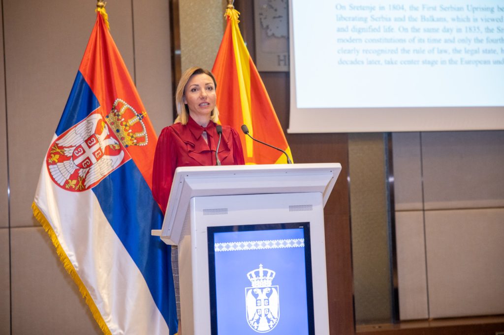U ime Vlade Srbije prisutnima se obratila Macura, koja je istakla da Sretenje simbolizuje težnju ka slobodi, pravdi i uređenom društvu zasnovanom na vladavini prava i jednakosti i dodala da Srbiju u Severnu Makedoniju povezuju duboke istorijske, kulturne i ljudske veze, kao i zajednička evropska perspektiva u pogledu stabinosti i prosperiteta Zapadnog Balkana.